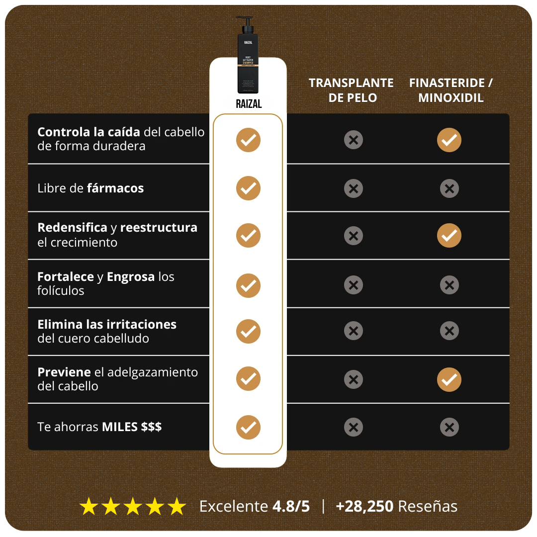 RAIZAL™ actúa bloqueando la hormona DHT (principal causa de calvicie masculina) y estimulando el folículo desde la raíz. Su fórmula está diseñada para hombres con caída leve, media o avanzada.